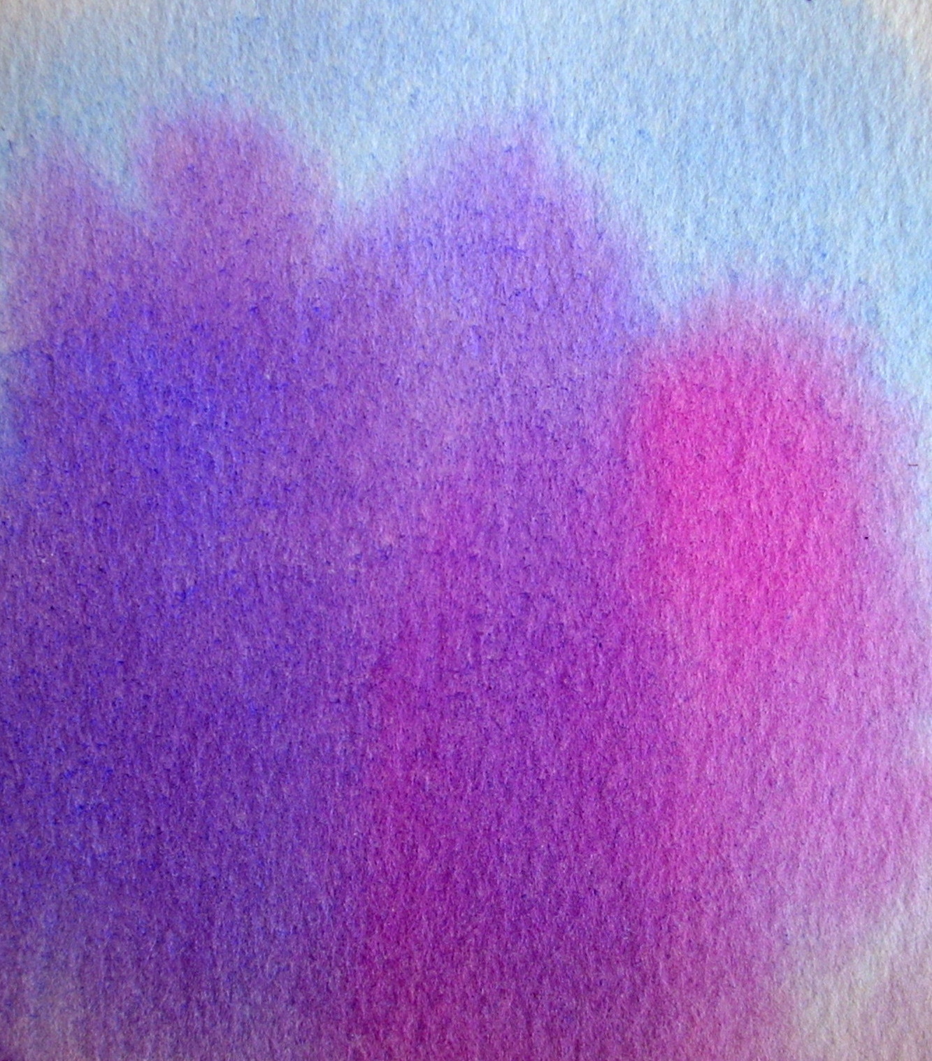 In the left hand side of the sample below, the back run (orange) is caused by uneven wetting of the paper. On the right hand side, the paper had begun to lose its sheen (sheen is the reflection of light caused by water on the paper surface when it is wetted) before the colors were dropped, leading to the colors staying put and not getting blended.