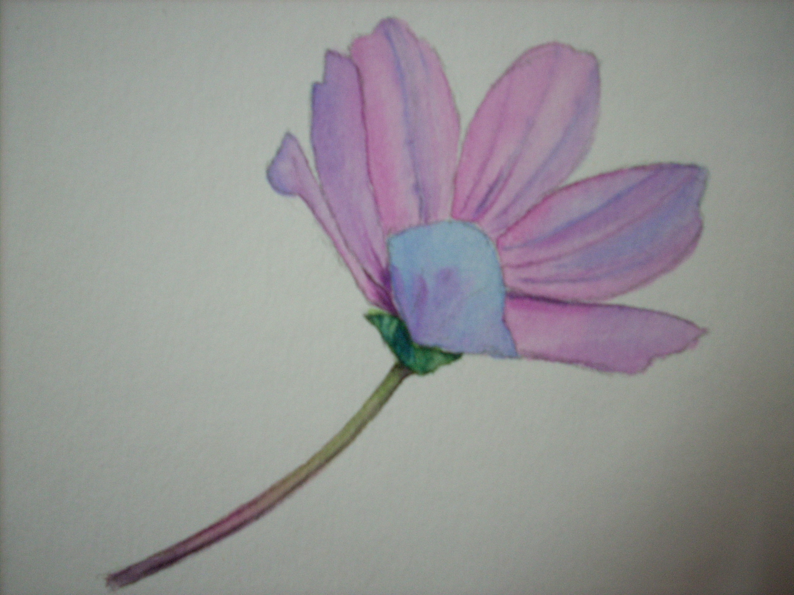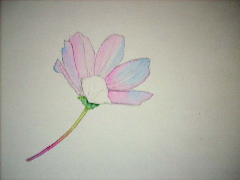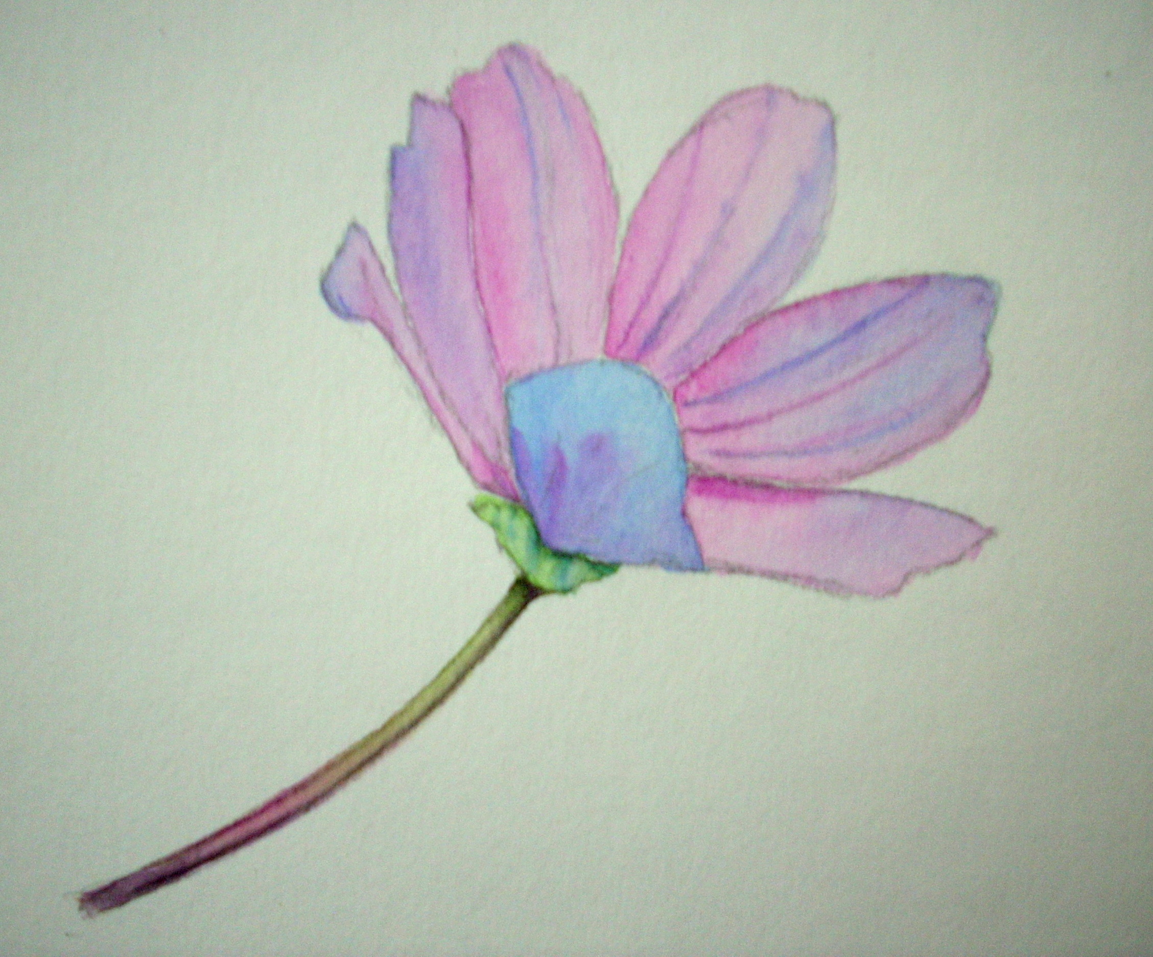 Take a good look at the photo and pick out the colors on the petals. They are mostly pinks and bluish violets for the shaded areas. The sun is casting its light from the upper right hand side. Wet each petal at a time and drop in weak washes of brilliant purple and pthalo blue (Schminke) or the equivalents in your pallette. Paint alternate petals because if you wet an area next to a damp petal you will get a back run. The stem looks really lovely with muted pinks and violets at the bottom and yellows and green near the base of the flower. With a small round brush wet the entire stem and drop in colors accordingly. Let them blend gently and don’t worry about getting it exactly right. The water creates beautiful effects if we learn to leave it alone at the right time.