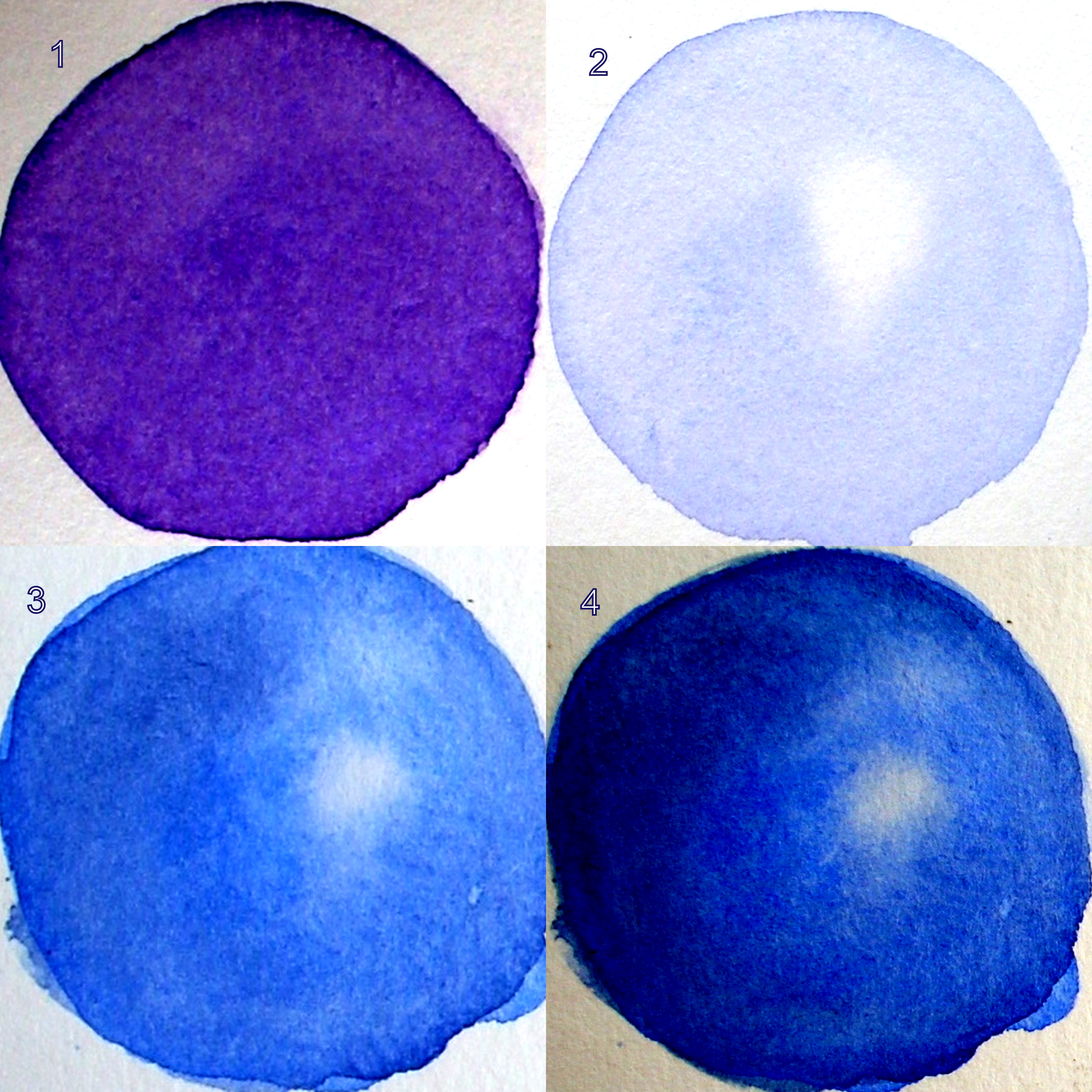 Before we move on to the flower demo, lets have a quick look at building forms. In fig 1 below, the violet circle is painted as in a basic wash, It looks flat because the value is the same through out the circle. In a solid three dimensional object in the outside world, light falling on objects causes them to have a number of values. Value is the degree of lightness or darkness in a color. To build the circle into a 3-d object, we need to add highlights and shadows and atleast some values between them to make the object look real. When a light source (the sun in the open, a light indoors) falls at an area on a circular shaped object (which is uniformly colored), that area looks the lightest valued, the area surrounding it progressively increases in value and the opposite side of the object which does not receive the light directly and which falls in shade is the darkest valued.