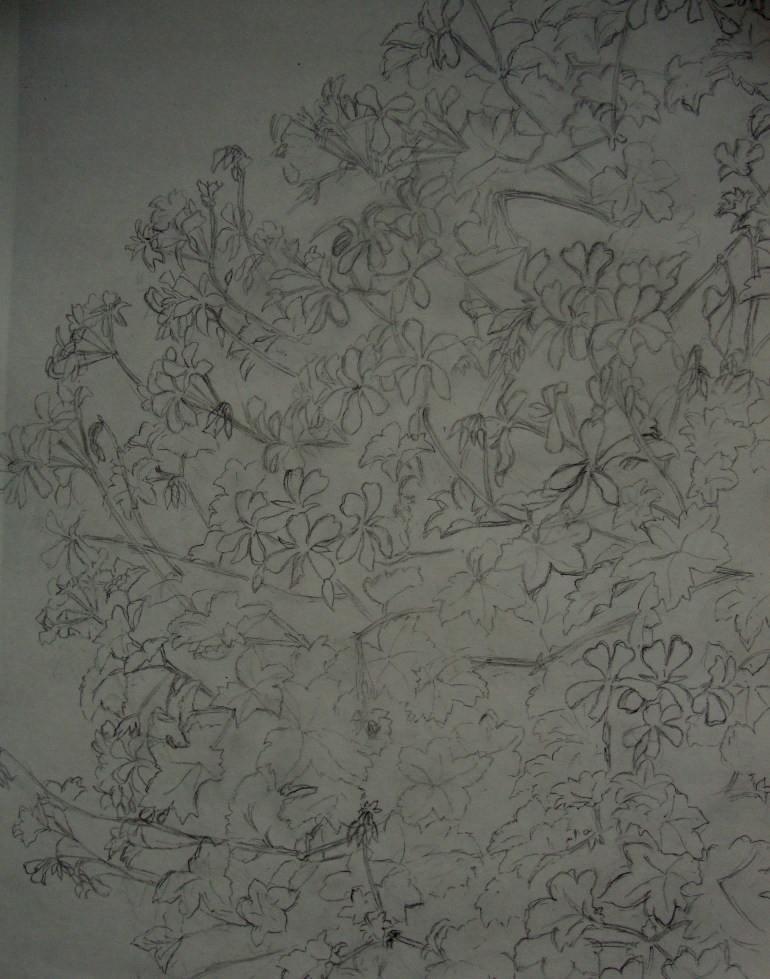 This is a portion of the drawing for my next painting. I`m still not sure about what color scheme I want in this one, though in real life these flowers are pink.