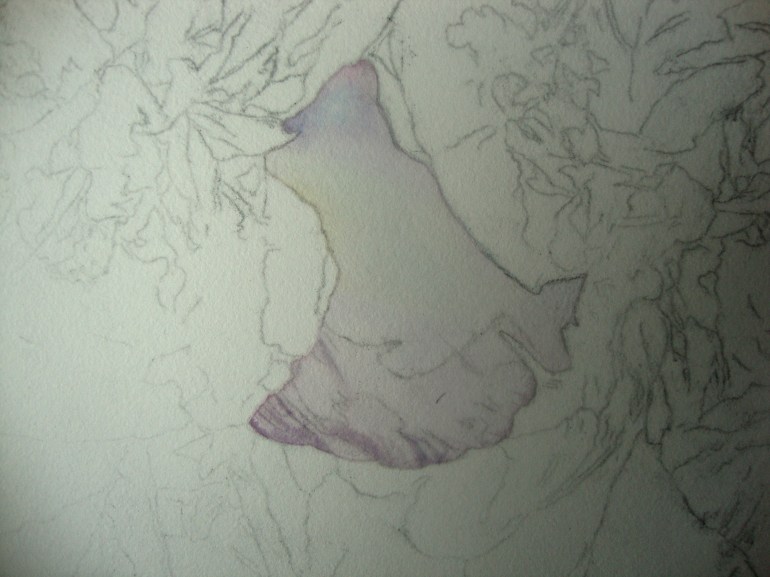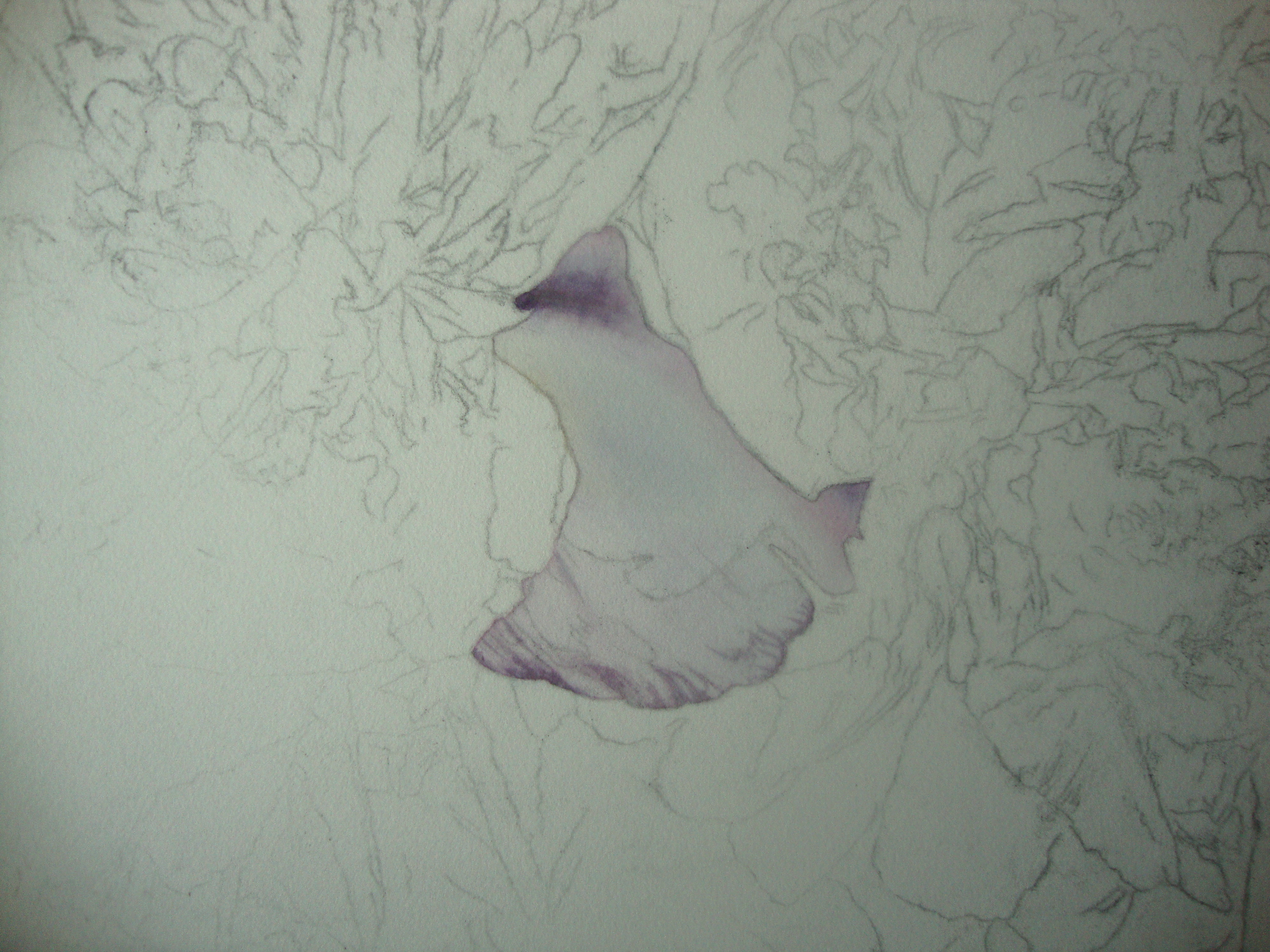 The colors that I have chosen for now are Schminke`s ruby red, DS new gamboge (because the yellow on the left flower is actually the tertiary color yellow orange and not a pure yellow) and MG phthalo blue. Here is the lower petal of the left most flower. I have already added the small shadows at the bottom of the petal in this first wet in wet wash.