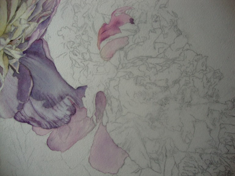 This flower is brighter and warmer than the first one, so the first washes are pure ruby red diluted with water.