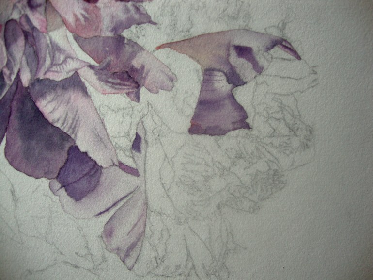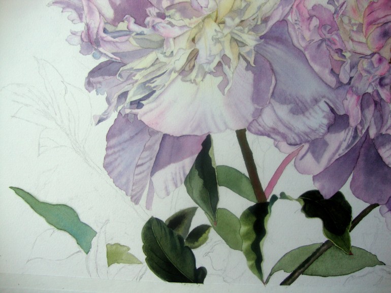 I made two mixtures of green for the leaves. One with varying amounts of DS sap green, MG phthalo blue and S ruby red and another with varying amounts of DS new gamboge, MG phthalo blue and S ruby red. The second one is for shadow areas.