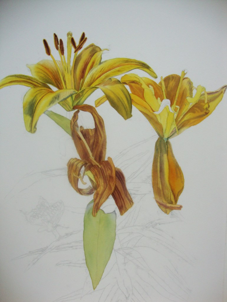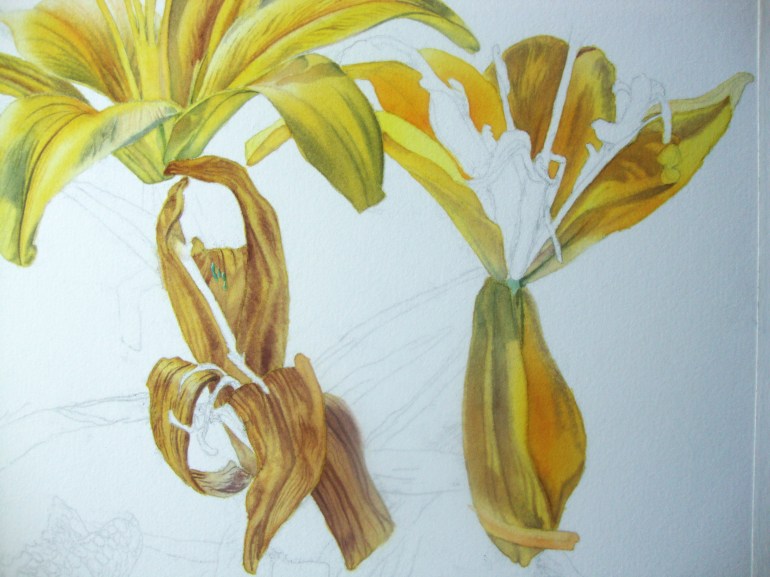 A light glaze of translucent orange (avoiding highlight at the top of right half ), dried and then the orange-mauve mix for deepening the shadows on the upper petal. The same for the right hand petal. Put a little masking fluid on the upper petal of the spent lily for lighter colored veins but I think I like negative painting better.