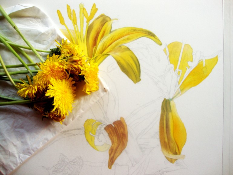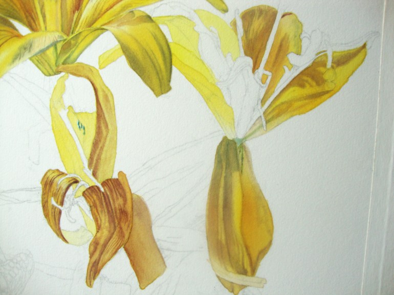 The left most petal – layers of hansa yellow medium , new gamboge, translucent orange. Dried. It has a very light glaze of mauve even though it doesn`t look so. This puts it in shadow and underneath the first flower; without the mauve it will pop forward. The small leaf at the top – green glaze mixed with hansa yellow medium, pthalo blue and raw sienna. The larger leaf – green mixed with new gamboge and pthalo blue.
