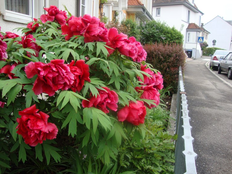 For the peonies, the color choice was simple, the orange red is almost the exact hue of M Graham`s quin red (PR209).  Another red which I chose for them, one which is warmer is PV 19, Schminke`s ruby red and Maimeri blu`s rose lake are almost the same hue (is the ruby red a tad cooler?) and though one is listed as semi transparent and the other semi opaque, they have the same level of transparency. For the lilacs, I`m going to change the color from this purple in the photo to a lovely burgundy shade that I had seen some time back (the first I had seen on lilacs). Burgundy is the tertiary shade (shade is a color mixed with black, tint is a color mixed with white and tone is a color mixed with grey) of violet-red. (tertiary color is a color made by mixing a primary with a secondary).Using this color ensures that there is harmony when the eye moves from the orange-red, red of the peonies to the red-violet of the lilacs instead of the jump there would be from the orange-red of the peonies to the violet of the original lilacs. (that said, I also feel that any riot of colors would work for flowers). Winsor and Newton perylene maroon (PR179) mixed with Winsor and Newton quin magenta (PR122) is the color I was looking for. Perylene maroon can also be used as the shadows for the peonies which would tie the two flowers together. Coming to the blue, I had my heart set on Winsor and Newton`s dumont`s blue for the sky which leans towards violet, the next spoke in the color wheel instead of a pthalo blue which leans towards green and which would have been a jump. But Dumont`s blue which has some red in it does not make clear greens, so I have opted for Daniel Smith`s ultramarine blue and new gamboge.