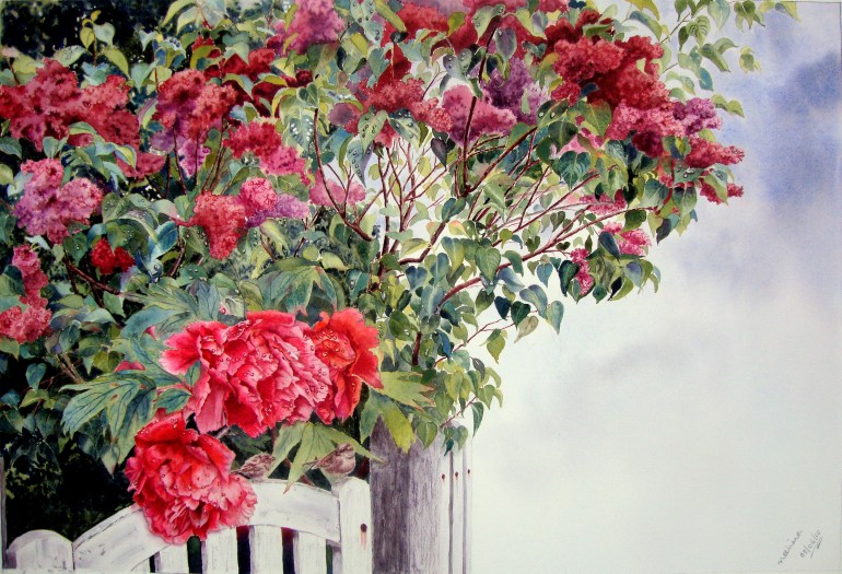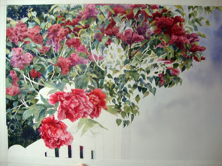 Here I`ve started on the background, just working my way on small bits around the foreground elements. There is an evergreen tree behind the lilac plant on the left hand side, so I`ve let some texture form there. Apart from the darker value, this texture is what separates the bg from the fg leaves.