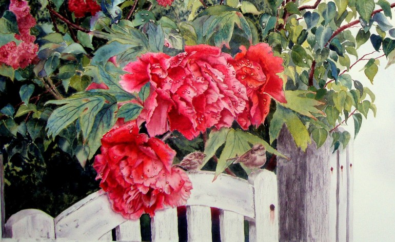 These birds are Feldsperling (German sparrow or Eurasian tree sparrow), they like the country side and feed mostly on seeds.. (but I`ve spotted them many times around Mc Donalds!) Wet on wet washes give these the fluffy appearance. The fence takes a bit of dry brush work after a very pale wet in wet wash of some neutral colors. For the iron nail, use perylene maroon with a bit of yellow and a bit of indigo. With a damp brush lightly bring the color down to make a rust streak.