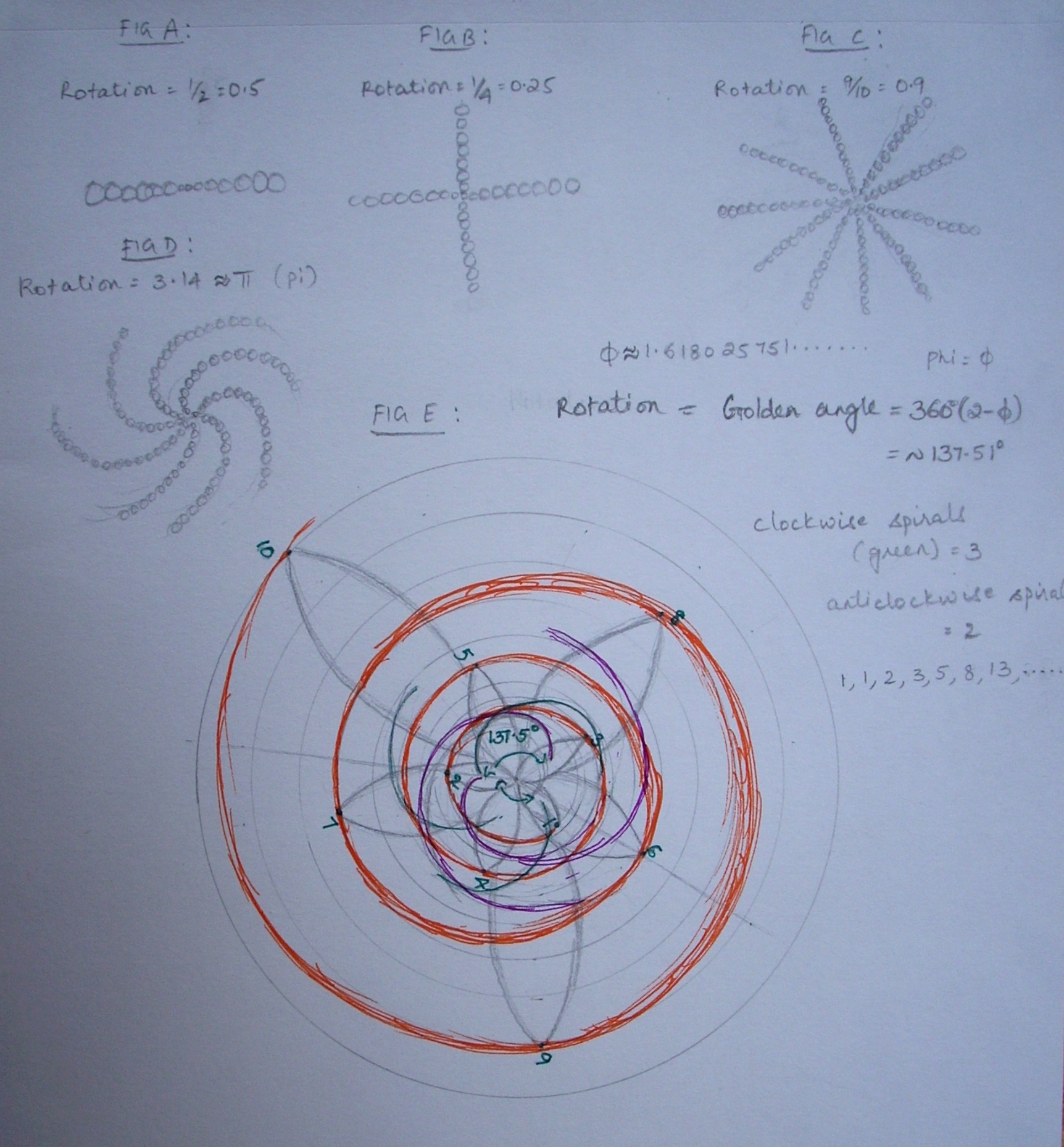In the heads of flowers, the most beautiful and well known example being that of the sunflower, phi is used in seed organisation. The heads consist of small florets which later mature into seeds. The seeds are produced at the centre and migrate outward to eventually fill out all the space. Each seed is produced at an angle to the previous one. Let us suppose that the seeds are produced for every half turn, that is 180 degrees. (fig a) This will cause the pattern of seeds to be in a straight line which is clearly not a very efficient way of filling the space since there are a lot of gaps. The same is the case for one quarter of a turn (fig b) or for any decimal fraction(fig c) for that matter. Fig d shows the seeds being produced at an angle of pi (3.14..) which is an irrational number. Now there appears a spiral pattern but it is still not an optimal filling. For that to happen, the rotation has to be the most irrational number possible and that is phi. The corresponding angle, that is the golden angle is the smaller of the two angles created by sectioning the circumference of a circle according to the golden section. This is approximately equal to 137.51 degrees. You can see the resulting pattern corresponding to this golden angle in the daisy head photo. It appears as two sets of crisscrossing spirals one going left and the other going right and the number of these spirals in each direction will be two consecutive numbers in the Fibonocci series. i.e. they can be 5 and 8 or 8 and 13 or 34 and 55 etc depending on the size of the flower head. Also, since the petals are formed at the extremities of the spirals the number of petals in a large number of flowers are also Fibonocci numbers. What is simply amazing is that a flower can make such a precise measurement of angle, even a very slight change of 1/10th of an angle can disrupt the optimal filling! In the same way, a plant uses this angle in leaf growth to ensure that all leaves receive the maximum amount of sunlight and dew (fig e). Leonardo da Vinci was the first to describe this type of leaf arrangement in plants.