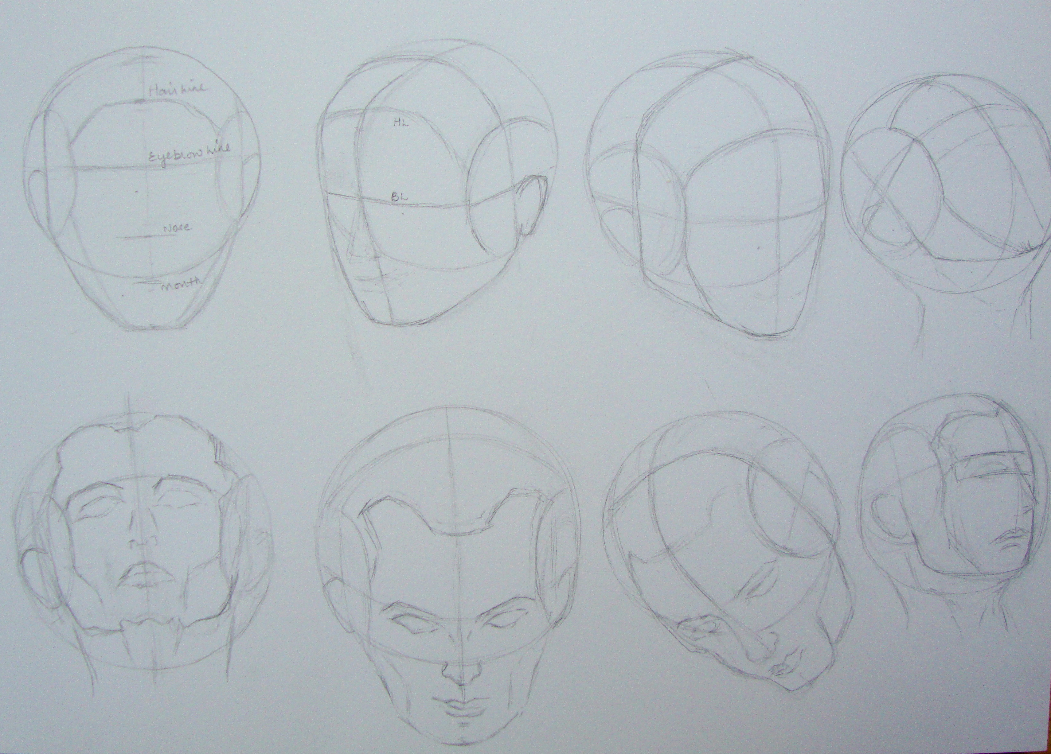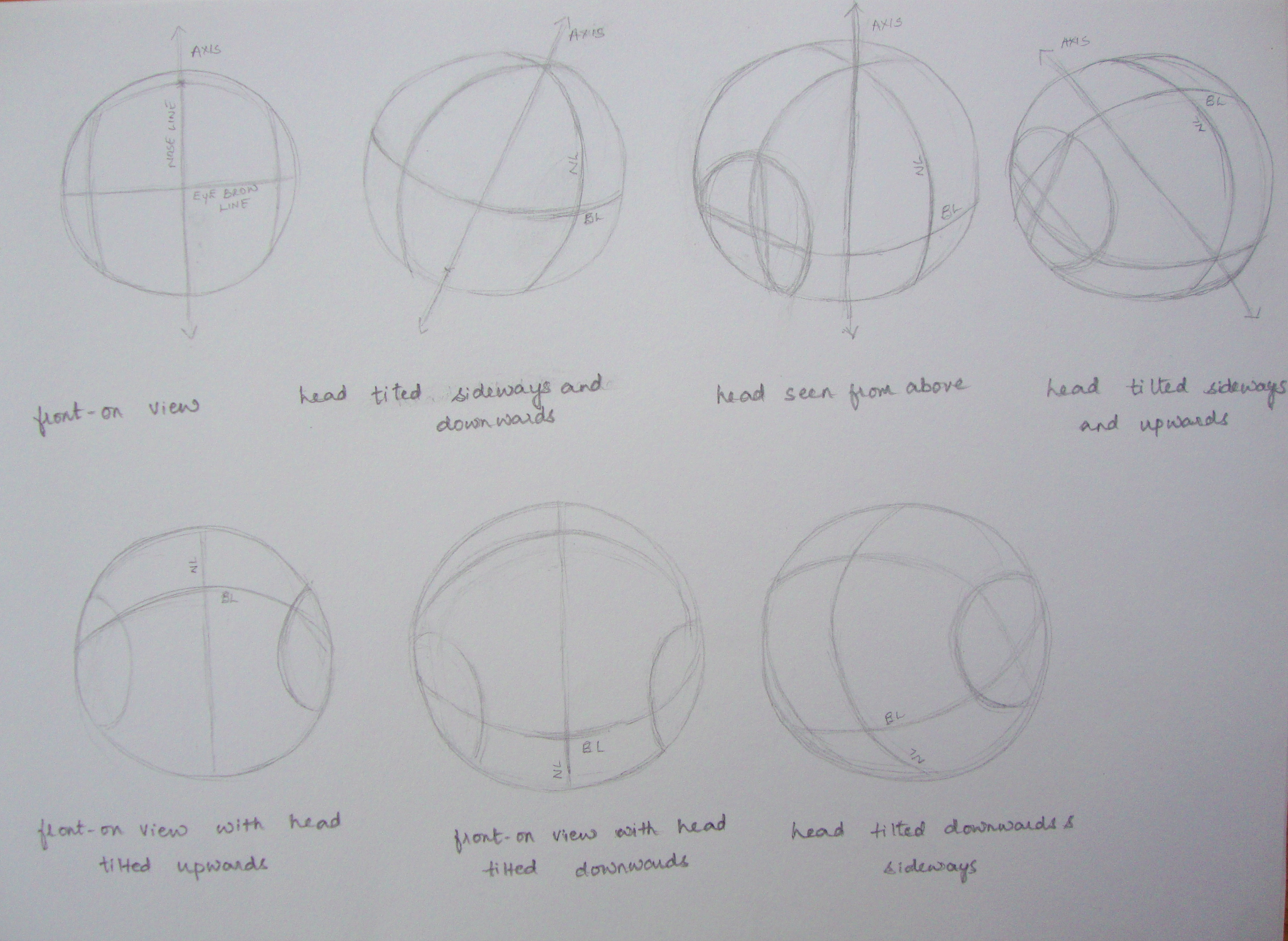 First simplydraw a circle. If you run an axis from the top to its bottom and a line along its equator, you can already imagine it be a sphere instead of a circle, even without any tone or value. Divide the sphere into quarters to further aid in this imagination. The sphere tips in the direction that you tilt the axis. Now if you slice off the sections at the sides of the sphere, you will get the sides of the head. The equator line becomes the eye brow line (the position where you place the eyebrows, not the eyes) The front of the head is curved but not as rounded as the sphere, therefore flatten it out a bit and bring it down a bit to get the bottom of the chin. i.e., Mark a point about halfway between the eyebrow line and the point where the axis comes out of the sphere, that gives the hair line. Almost about the same distance below the eyebrow line, is the end of the nose, the same distance below that is the bottom of the chin. The top of the ear usually lies on line with the eyebrow line and the bottom of the ear on line with the end of the nose.