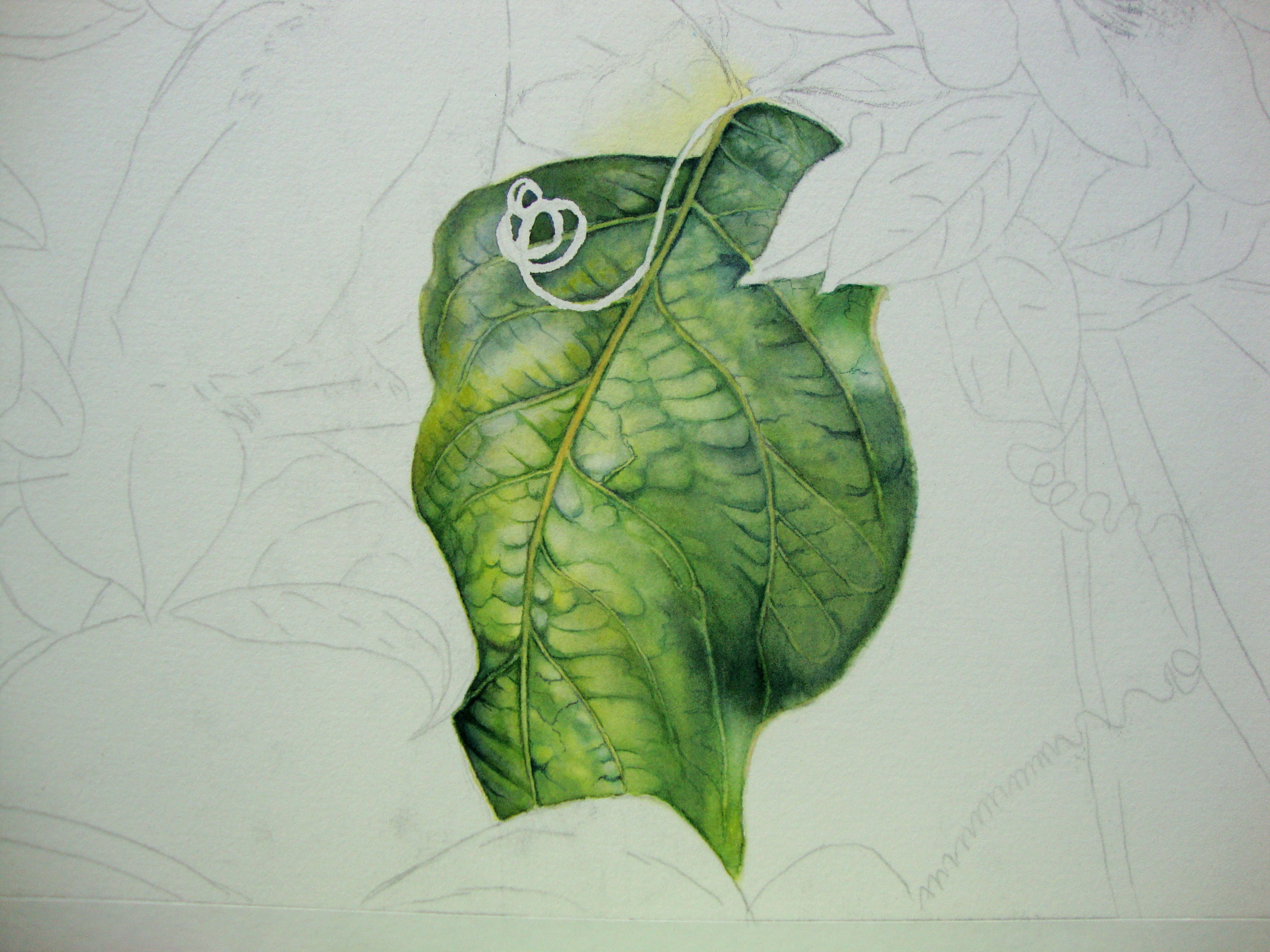In the previous layers, I had wet the leaf area leaving the veins dry, here except for the central vein, I wet the entire area, so that the veins don`t look that prominent: