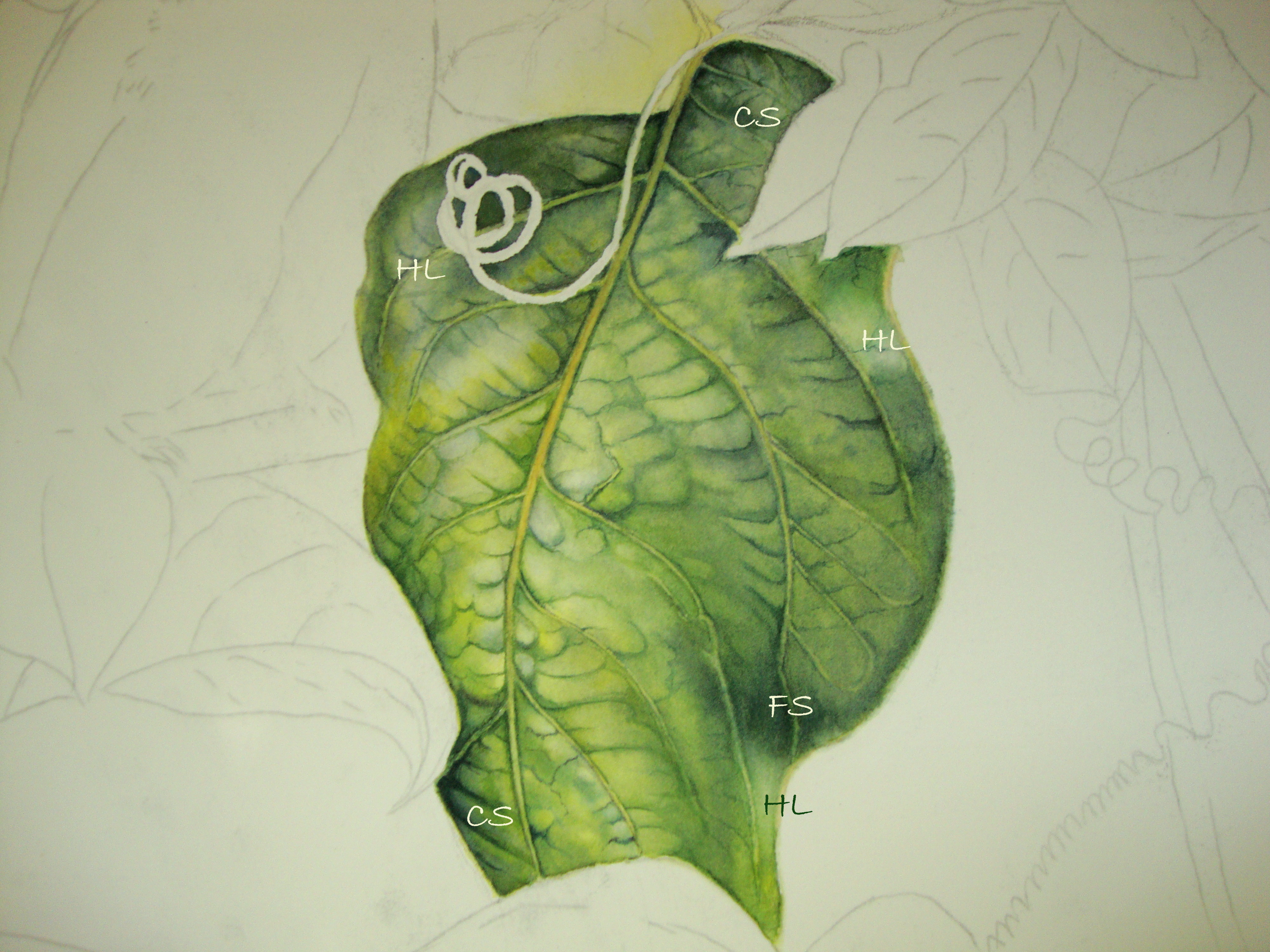 Sometimes I had divided the leaf up in segments to paint smaller areas, but mostly I worked on the leaf as a whole. Its easier for me to see the shadows this way. The upper part of the leaf is in cast shadow (marked CS on the photo), thrown by the leaves above it. The lower part is brighter and more yellow. The right part has an important form shadow (FS) on it, this shows how the leaf is turning in on itself, just below that is a highlight. Also on the upper right of the leaf is a highlight , caused by the reflected light from the white flower above.
