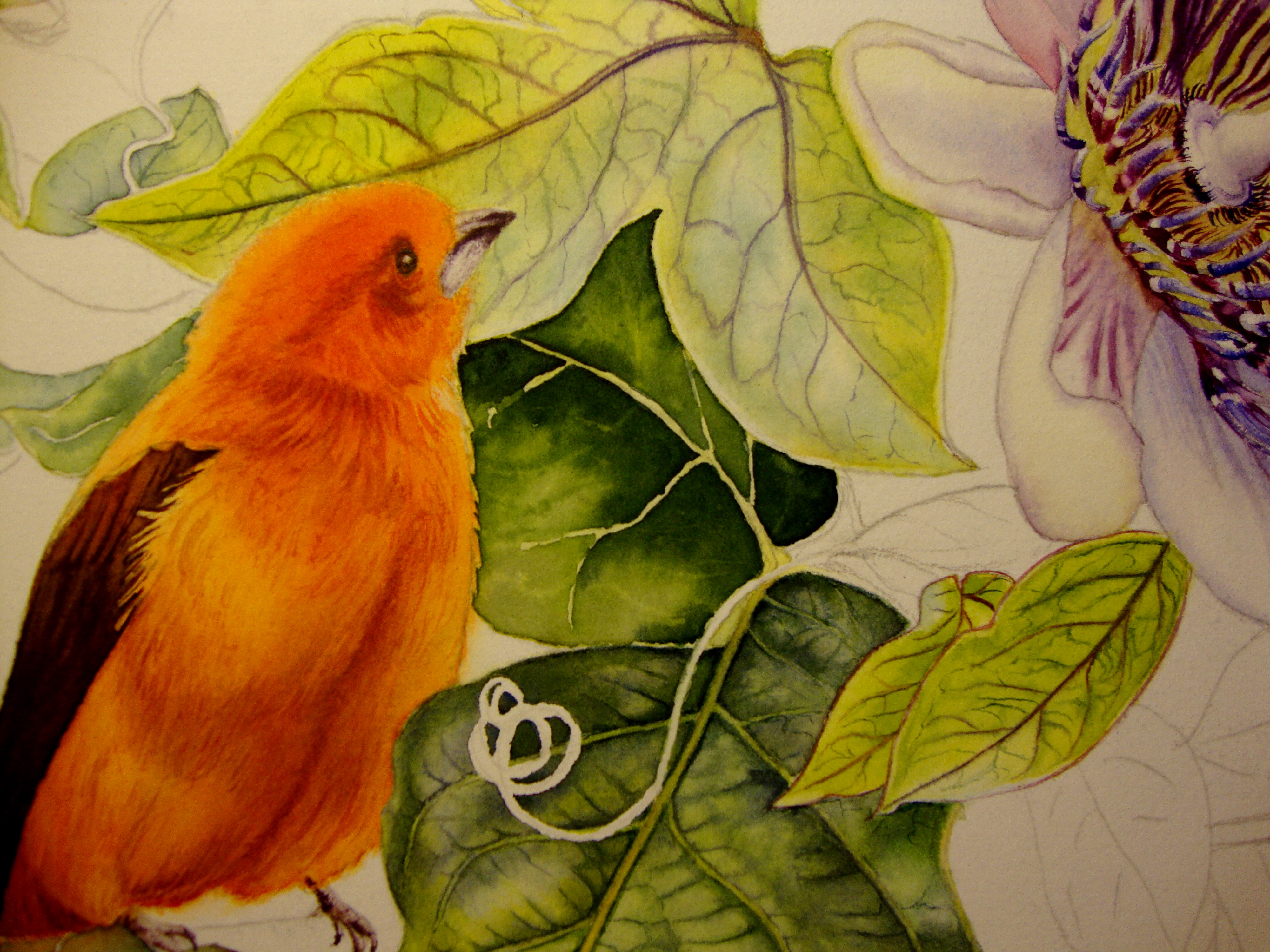 This leaf behind the bird has some of the darkest values. The first layer is a greyed yellow, the second one has the shadow green flowing into the first wet in wet.