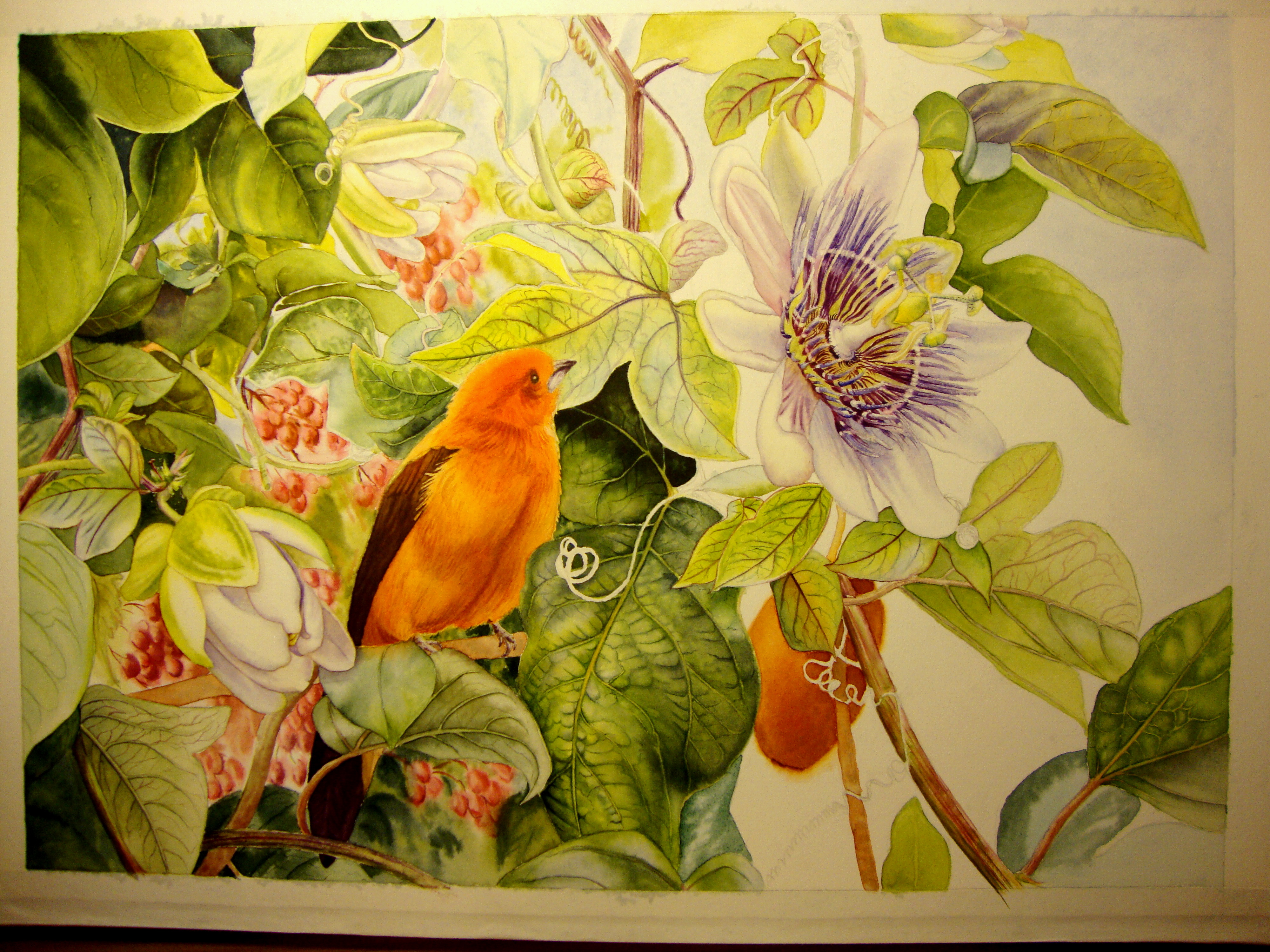 I`ve chosen to add berries and a passion fruit to bring the orange down and into the rest of the picture and also so that it looks like the bird has had something to eat! The berries have been painted in on a wet in wet wash. Keep the reds subdued by adding cobalt blue tone so that they donot attract more attention than the bird. For the passionfruit also, the orange has been subdued by adding blue and the edges have been softened with a damp brush to push it into the midground.