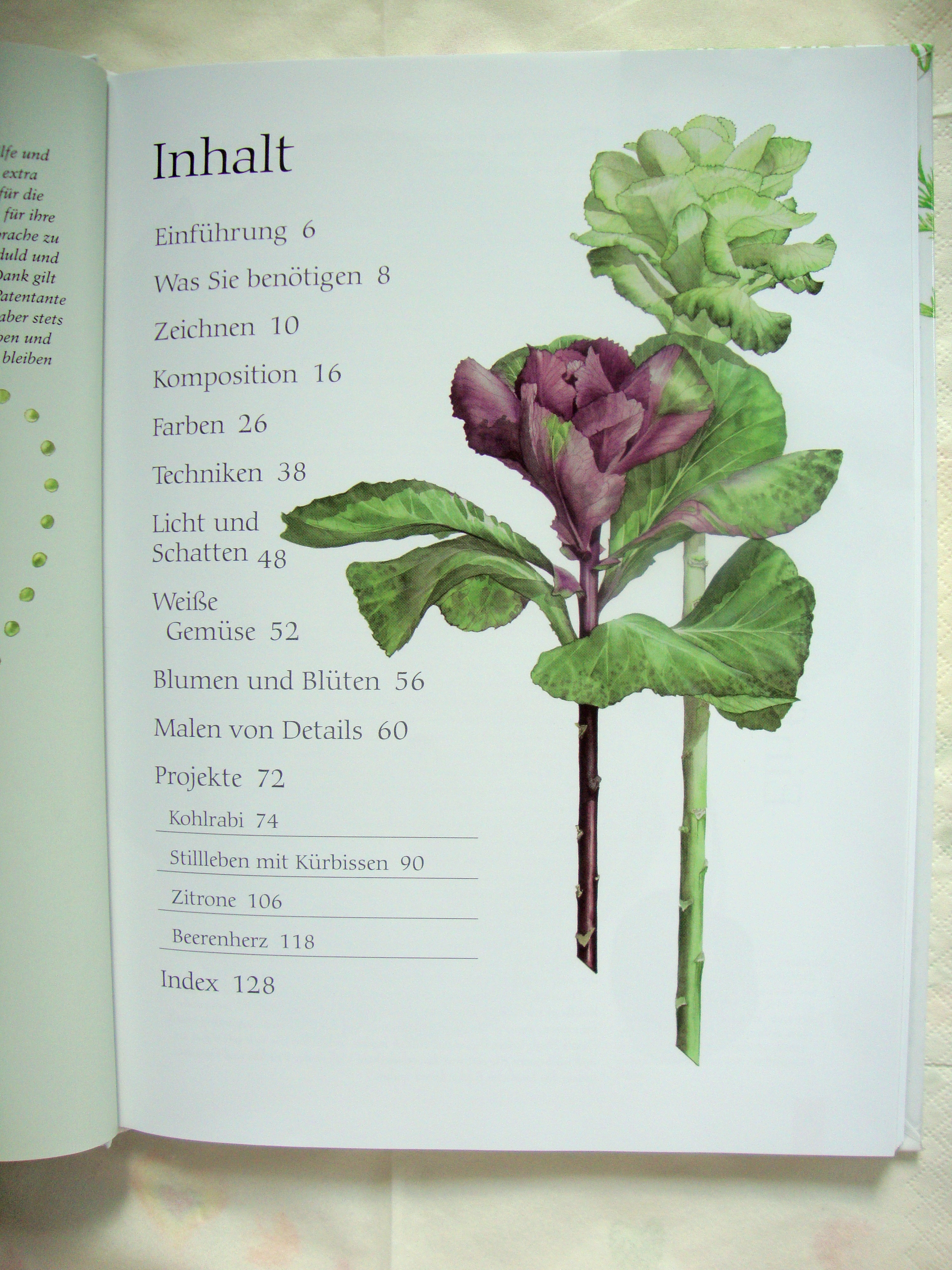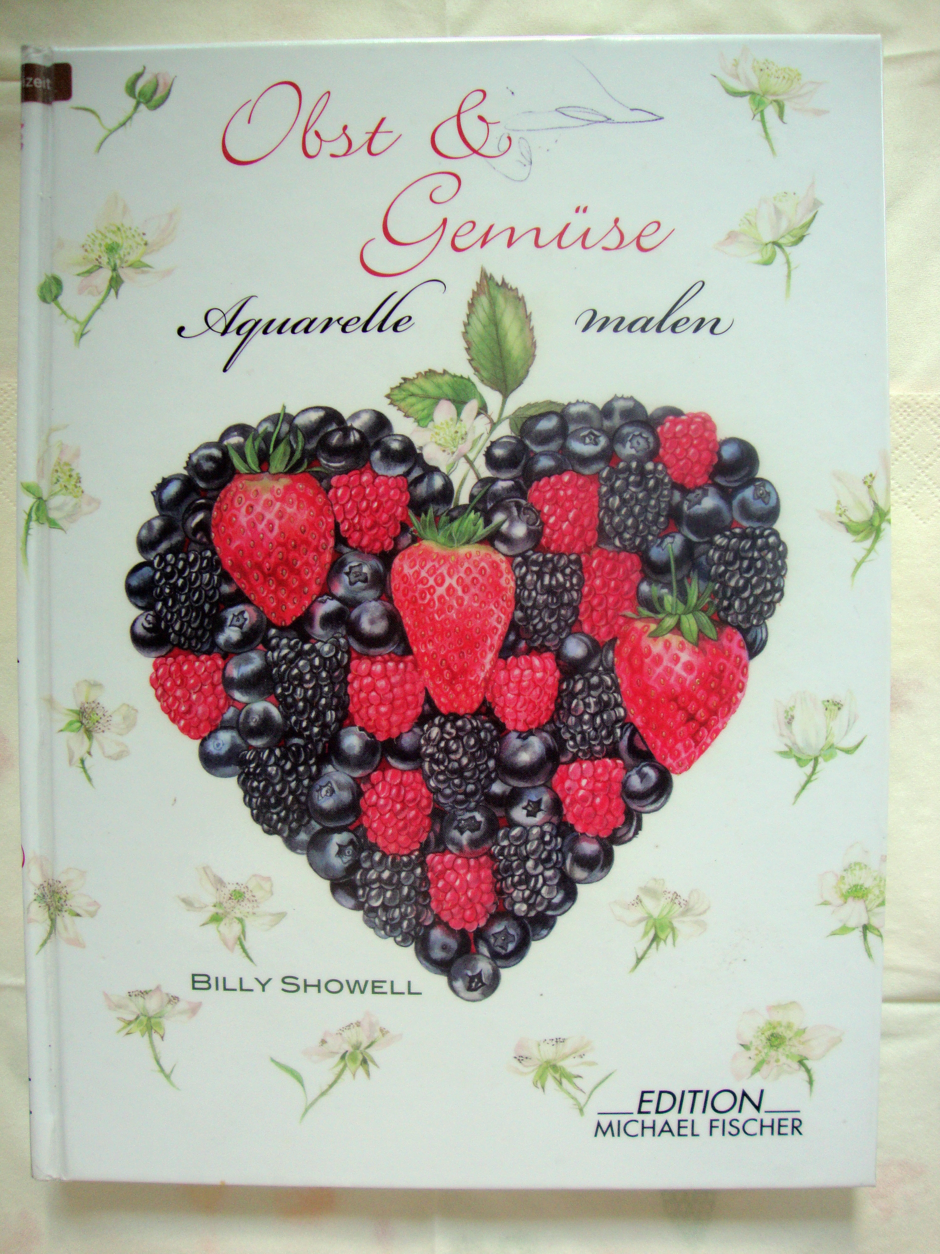 I really like botanical painting a lot, so when I found this book by the botanical artist, Billy Showell at our library, I got very excited. I read the whole book through, with an English-German dictionary by my side. It has lovely pictures of beautifully rendered fruits and vegetables, along with information on the colors and materials she uses, drawing tips,lighting and composition tips, watercolor techniques, a chapter on how to build form through light and shade, a demo on how to paint white subjects and some flowers too. At the end, there are four large, detailed projects of a kohlrabi, still life with pumpkins, a lemon and the heart of berries which is on the cover. There are lots of photos for each step from the beginning to the end, so the demos are easy to follow along. A very useful book to have if you`re a beginner in watercolor and want to start off with paintings fruits and vegetables from real life.