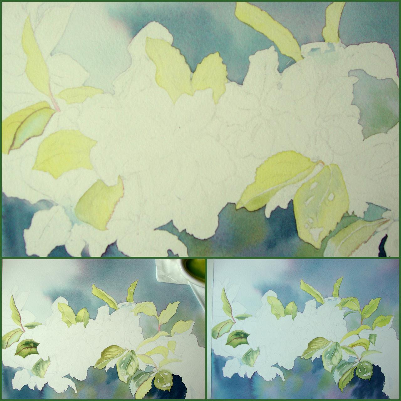 Apple blossoms are usually pink as buds and then start turning white as they flower; a few varieties are actually dark pink and some have just the edges that are pink and those are what I´ve chosen to paint. My photograph has the light coming directly overhead and the painting has it falling from the left, so I´ve changed the lighting accordingly for the flowers and leaves. As you are modelling each petal , imagine the direction of the light and ask yourself whether the area that you are painting will catch the light or fall in shadow.