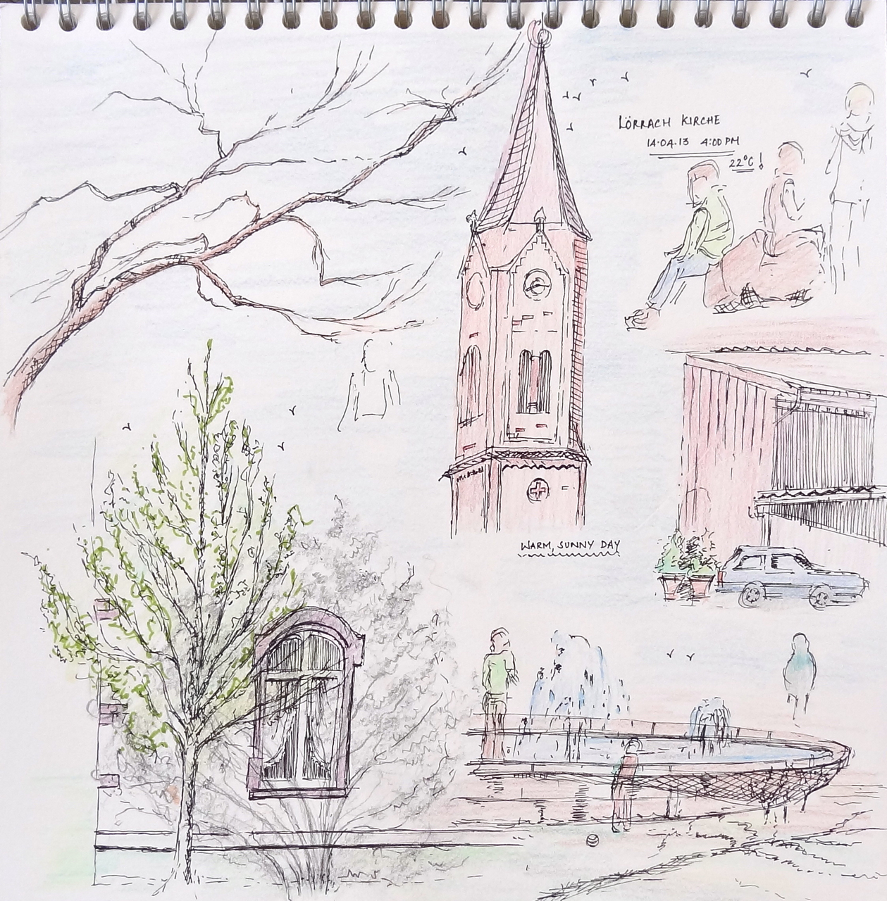 I wasn’t expecting so many people to be out, it being a sunday yesterday, but it was the first real good weather day we have had after a long, long time and I guess all the mommys (and daddys) in town were anxious to get the kids out of their hair and out into the open air. I have been sketching from life quite a lot lately, indoors from my windows or a few minutes standing on a deserted street but this was the first time I sketched outside amongst so many people (intimidating, to say the least!!). I took Arya out to the spielplatz (play area) and he behaved like an angel… well, maybe not to the younger boy he was bossing around … anyway…. that being beside the point… I started quickly and doggedly with a pen, on the church tower and after that I was able to relax, it was quite blissful to feel the warm sun and cool breeze on my face, hear the children playing and quarreling, and sketch to my hearts content. I think I have finally overcome my trepidation to painting plein air, the people and the kids were actually quite sweet about it and dropped by to appreciate my zeichnen skills…