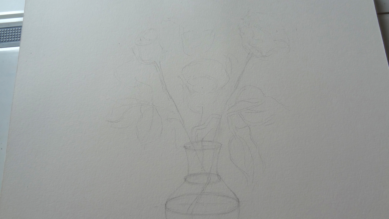 I lightly sketched in the vase with a pencil. The first thing to do when you start a drawing is to determine whether you are looking up at the object or down to it. Here, I am looking down, so the ellipses of the vase get wider/ fatter as they go down. Determine the height and width, draw a center line and then make ellipses at the neck, throat and base and any where else that it changes shape. Connecting the outlines should give you the shape of the vase.