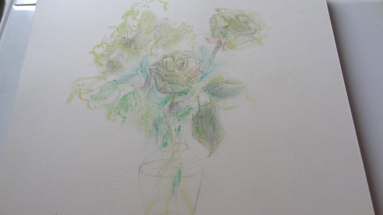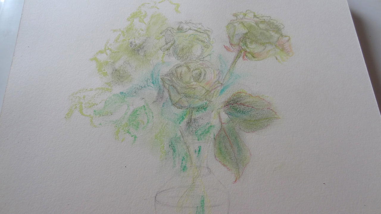 I blocked in the major shapes with pastel sticks, yellow, green and grey: