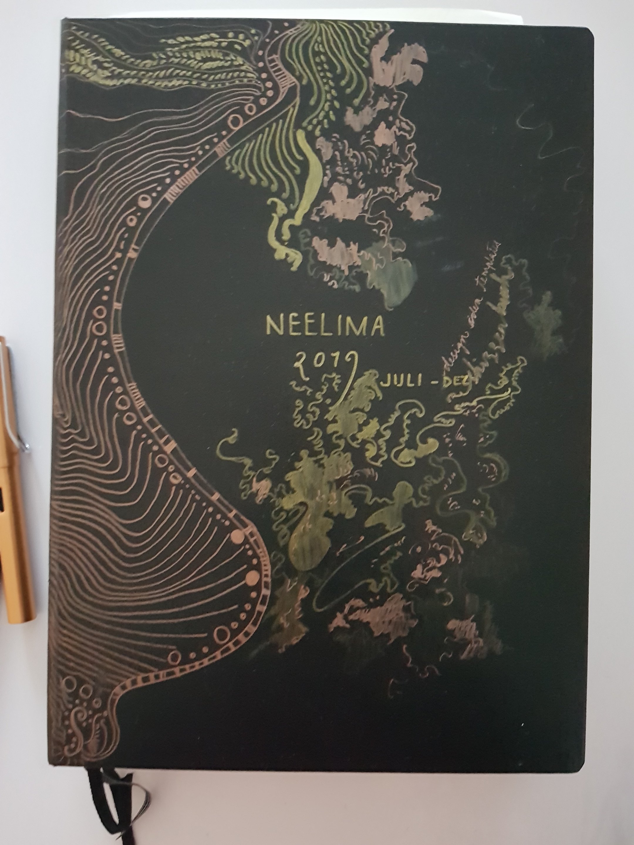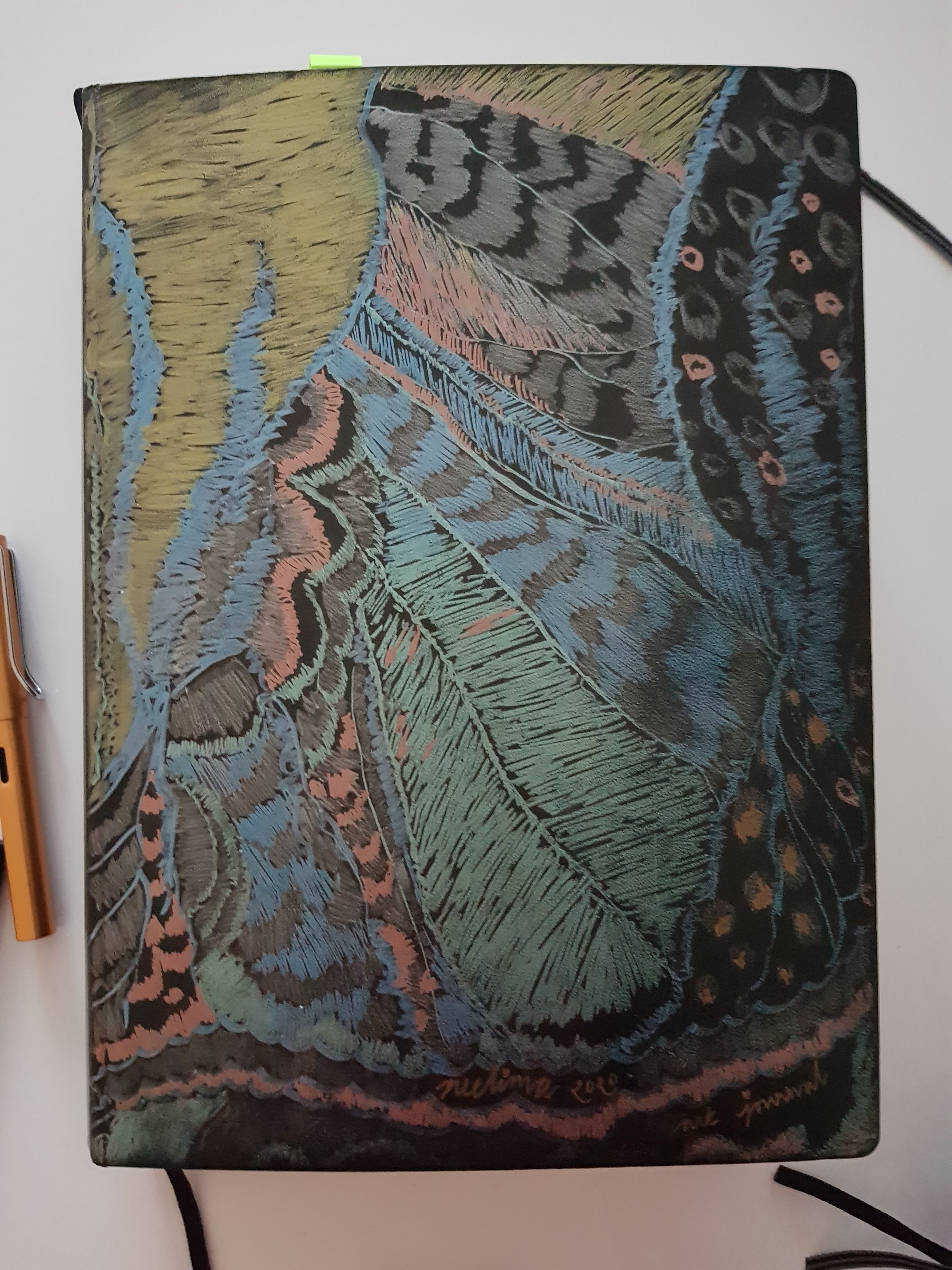 Another one is a Leuchturm diary, a day a page, it’s huge , some 400 pages A4 master (the others are of 234), I love it, I do whatever I feel like first thing in the morning, journal, draw, sketch, take notes, color notes of the changing light in the day etc., it’s only 100gsm but it takes markers and pens well, practically no bleedthrough at all. These past two years have been tough for me and I am glad I could channel some of my energies this way, by journalling. The cover which is inspired from butterflies and moths and two pages from this book, I like the second one, it looks complex but I haven’t ‘thought’ about it, it just came about: particularly the past year I think I have become a lot better at compositions: