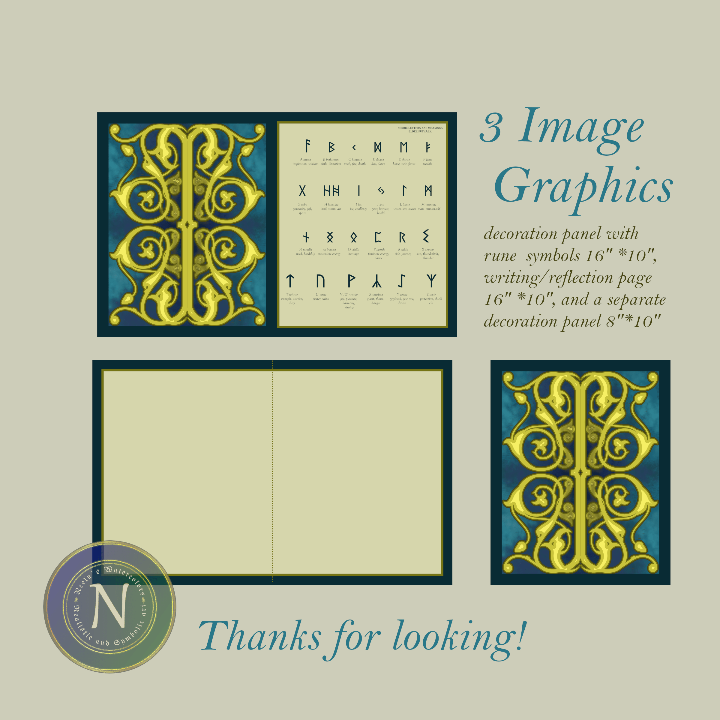 Hi everyone, how do you like my new printables? I created this decorative panel in Inkscape with bezier tools and power strokes. The leafy scroll pattern has a four fold symmetry, meaning I just did the top right quarter, this is mirrored left and to the bottom panel. Was quite fun. The opposite page contains rune symbols to reflect on and the back of the page can be used for writing and can be pasted to your journal. Can also be used as book cover, both physical and digital.